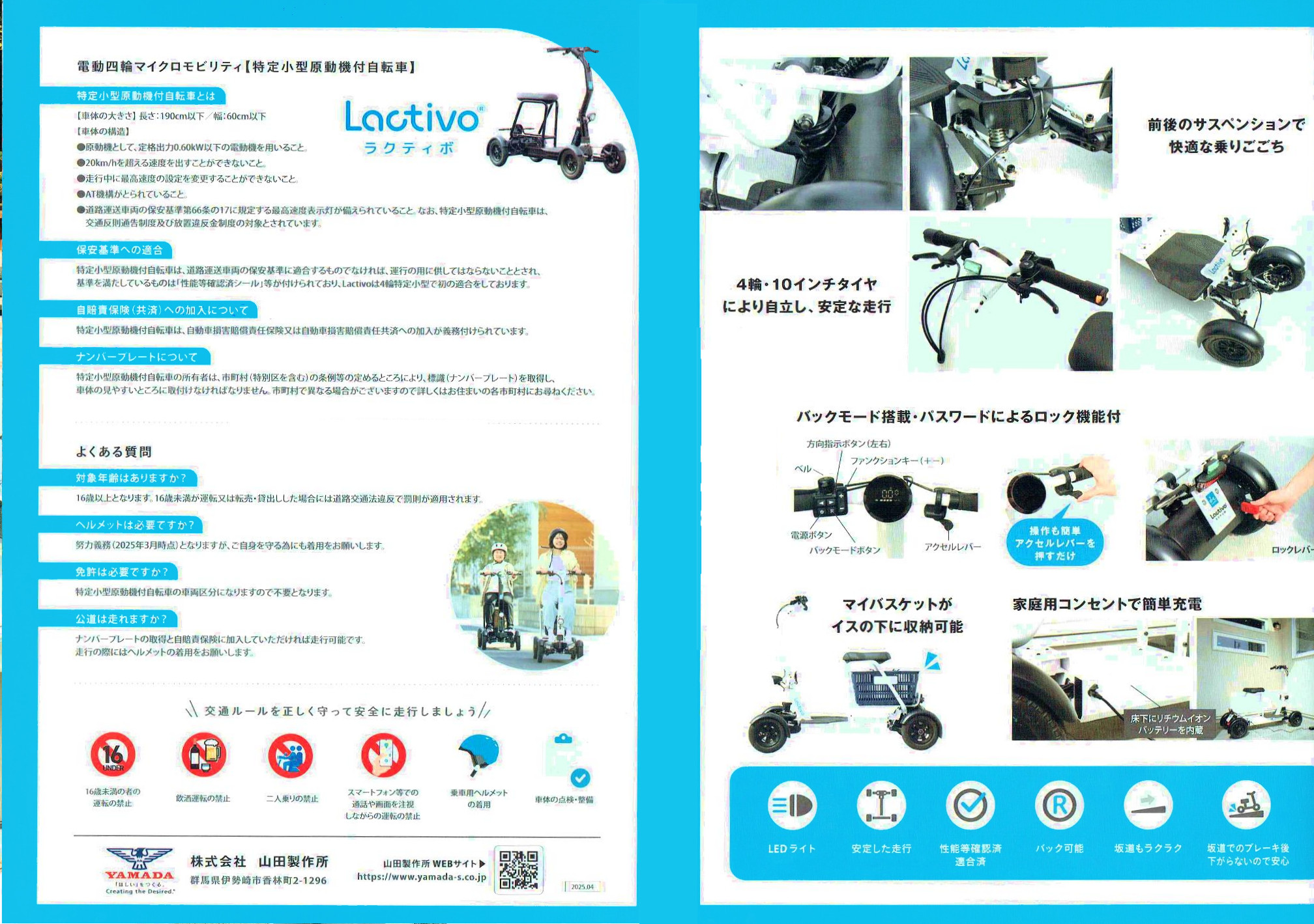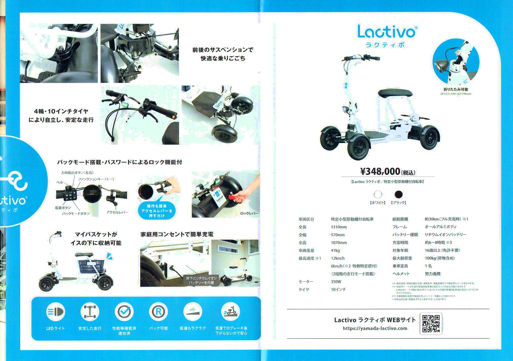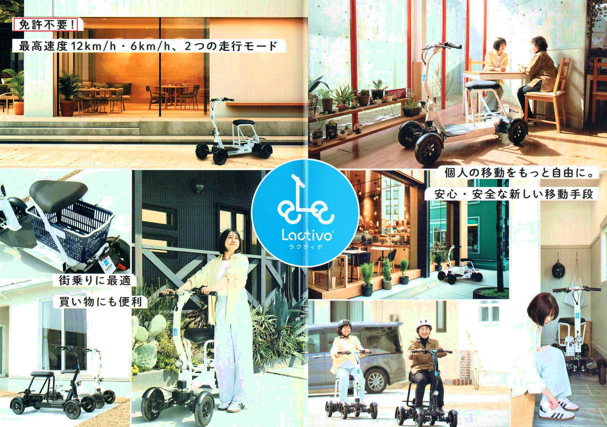 | ------------------------------------------------------------------------------------------- Lactivo ラクティボ/特定小型原動機付自転車 ・バックモード搭載・コンセント充電 電動アシスト自転車購入補助金(令和7年度環境都市推進補助金) (画像を押すと拡大します) ![]() Lactivoラクティボは、歩道用速度 6km/hモードと車道用12km/hモードの2段階速度制御が特徴です。 サスペンションと4輪タイヤにで安定性が高く、家庭用コンセントで充電。椅子下にバスケット収納も可能。 市の補助金対象です。 ![]() ![]() ![]() ![]() ----------------------------------------------------------------------------------------- アフターも充実しており、安心迅速にサポートさせていただきます。ぜひご相談ください。 電動車いす マイピア (画像を押すと拡大します) ![]() アテックス「マイピア」は、家庭用100Vで腰をかがめずそのまま充電できる自動充電器内蔵で、最長約30kmの連続走行と前進0.5〜6.0km/hの無段階速度調整を備えた実用的な電動車いすです。 ノーパンクタイヤ・傾斜センサー・緊急コール機能など安全性・利便性を高める装備を標準搭載し、安定した乗り心地と日常使いに適した設計になっています。 ![]() ![]() ![]() ![]() ![]()